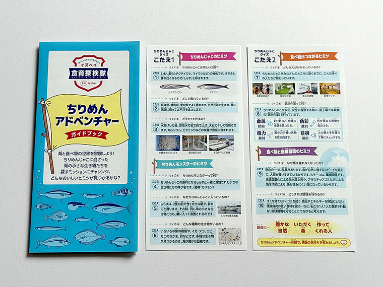 ガイドブックは、ちりめんモンスターの図鑑としてだけでなく、クイズなどを通して楽しみながら食を学ぶことのできる、内容盛りだくさんの高密度な学習メディアとなっています。
