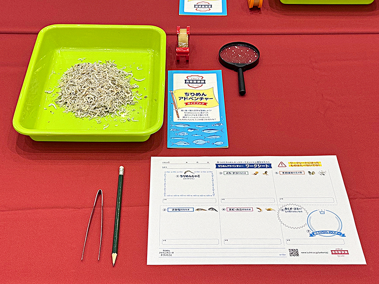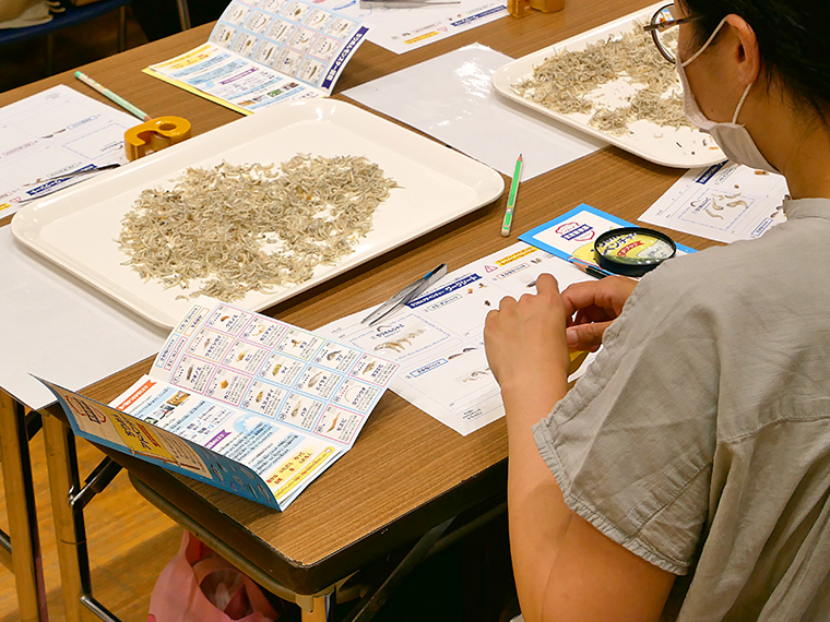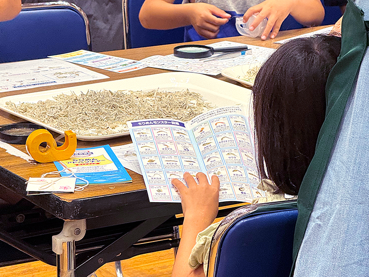 同社が実施してきた、大人気の参加型食育プログラムが「ちりめんアドベンチャー」です。選別前のちりめんじゃこに混じったイワシ以外の生物(ちりめんモンスター)を見つけて、何の生物か同定しながら取り除きます。ゲーム的なワークを通じて、多様な海の環境や、食品の加工・製造工程を学びます。